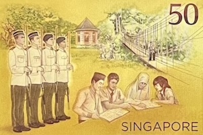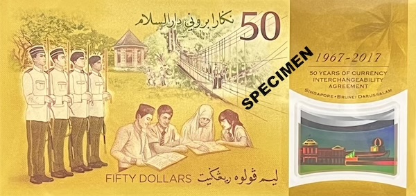Other than with Brunei, Singapore has never issued a banknote jointly with another country—not once, let alone twice. The CIA40 and CIA50 notes remain the only banknotes we have ever produced with another nation. They are also the only occasions where our artists worked with counterparts from another country to design the notes. In addition, the CIA50 note modified several security features. It was the first note to feature a Lion Head symbol that appears under ultraviolet (UV) light, alongside UV-visible denomination numerals. It also used a new form of micro-lettering, where the numbers ‘50’, ‘1967’, and ‘2017’ were hidden within the background designs, and appears faintly under extreme magnification.
