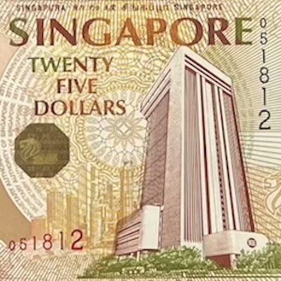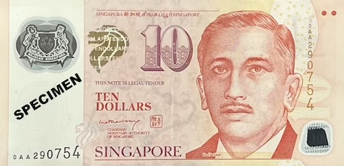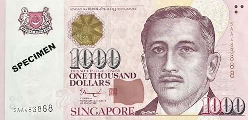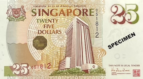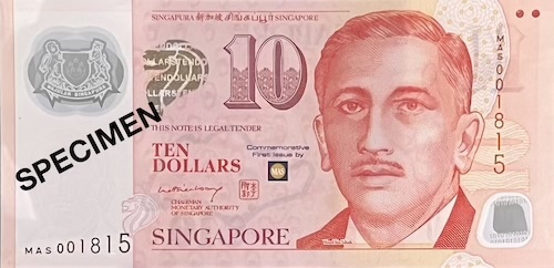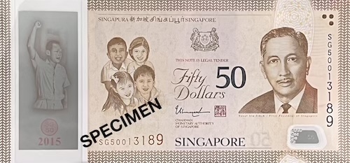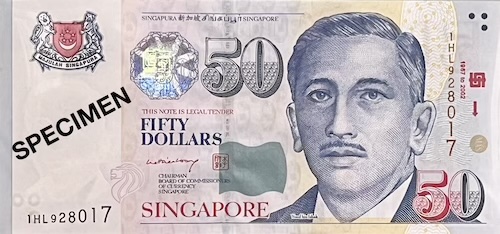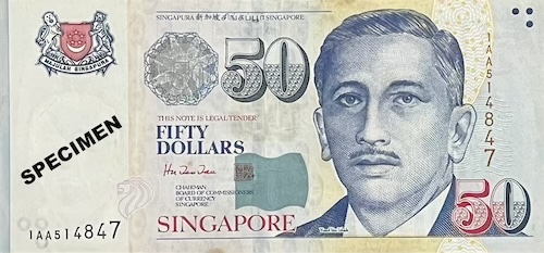 Commemorative notes come in three types. Some have completely new designs created for major national events. Examples include the 1990 SG25, 1996 MAS25, 2007 CIA40, 2015 SG50, 2017 CIA50, and 2019 B200 notes. Others closely resemble regular notes but include small changes, such as a special overprint, a unique prefix, fancy serial numbers, or being issued as uncut sheets. These are made for smaller, but still meaningful occasions—for example, the launch of a pair of books about President Yusof Ishak and the Portrait series, which included a $1000 specimen note; the transfer of note-issuing duties from BCCS to MAS, marked by an overprint of both organisations’ logos on a Portrait $50; or the first issue of currency notes by MAS, which featured a “MAS” prefix and the MAS logo on a Portrait $10. On rare occasions, a commemorative note can even be both—a special edition of a special-design note. Examples include the SG50 note, which had an “SG50” prefix and blue serial numbers used on the 2015 SG50 $50, and the B200 note, which featured a 3-piece uncut version of the 2019 B200 note.