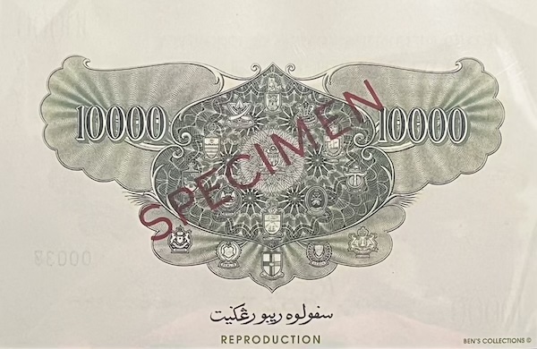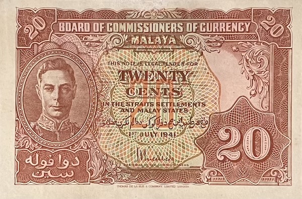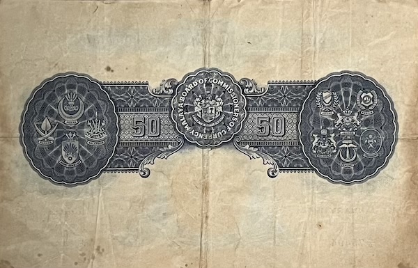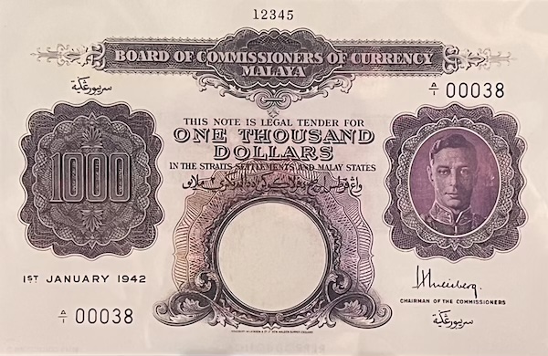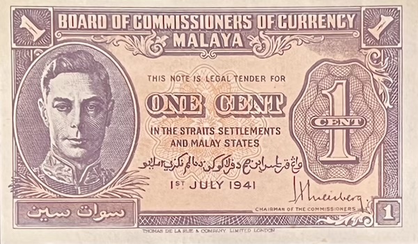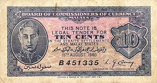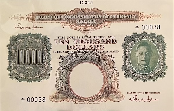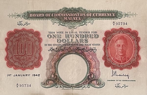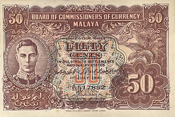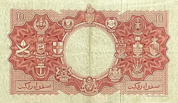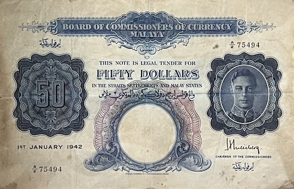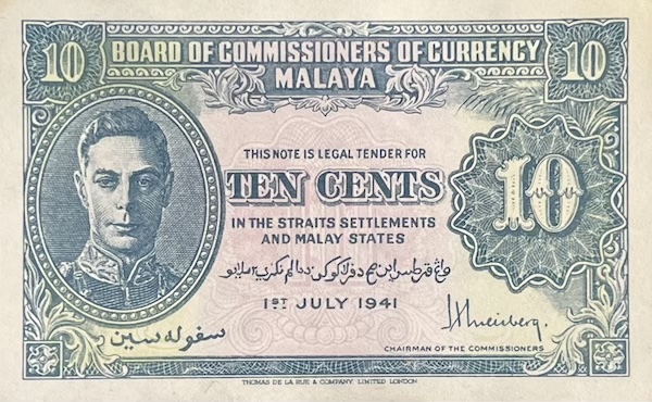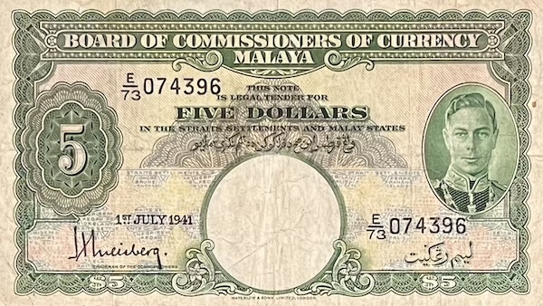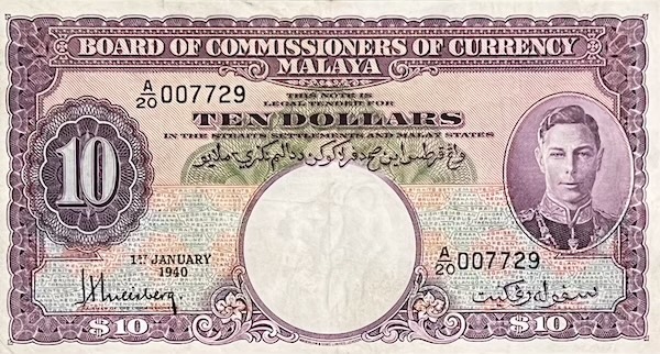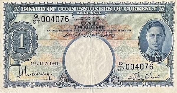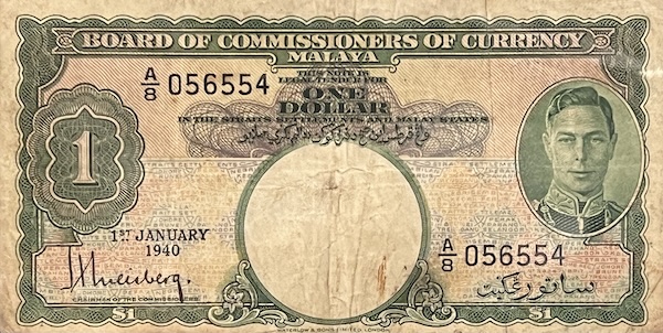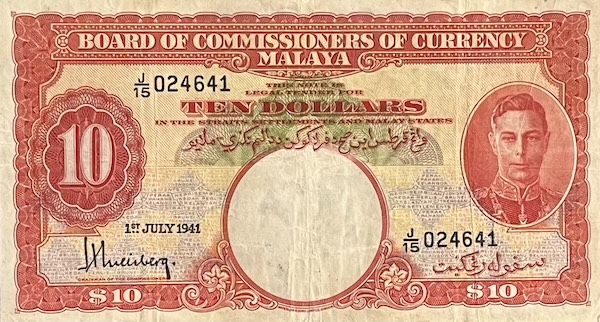 Plans for the Malayan dollar were already in motion before World War Two, with designs and preparations completed by the late 1930s. However, the outbreak of war and the Japanese invasion disrupted these efforts, and the notes were not issued. After the war ended in 1945, the British Military Administration introduced temporary currency before officially launching the Malayan dollar in 1946. Issued by the Board of Commissioners of Currency Malaya, these notes featured King George VI and marked the re-establishment of British economic control in the region. Printed on the notes were “1941” and “1942”—instead of “1946”—because these notes were printed in 1941 and early 1942, but the Japanese invaded Singapore in 1942 before they were circulated. (In fact, there was an even earlier batch of $1, $5, and $10 notes printed “1940”, but these notes were never issued after a portion of them were sank in two wartime maritime incidents when being dispatched from the UK to Malaya in November 1940 and January 1941. Only the $10 notes were officially issued in March 1941, but they too were replaced by the “1941” version after the war.)