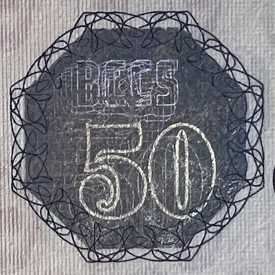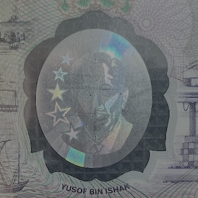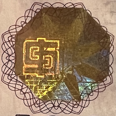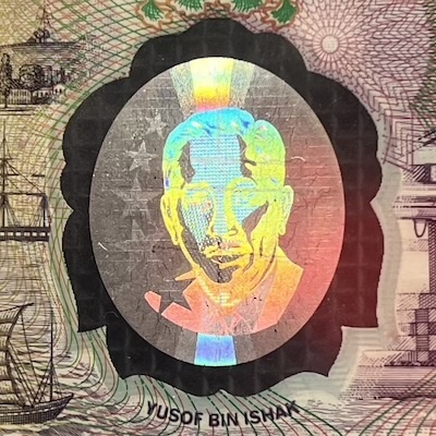 None of the commemorative notes used a true Kinegram. Only the 1990 SG25 $50 commemorative note used a hologram—a Kinegram-like feature—instead. It showed a metallic image of President Yusof Ishak that reflected a rainbow of colours when the note was tilted. It also reveals five stars, which represent our national ideals of democracy, peace, progress, justice, and equality. This hologram was an early version of optical security features but did not use the same technology as a Kinegram.