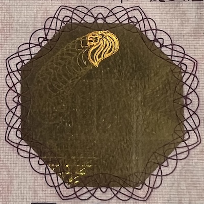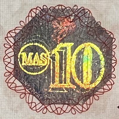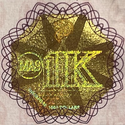 In Singapore’s Portrait series, Kinegrams were used as a security feature. On the $2 to $100 denominations, the Kinegram appears as an octagonal silver foil on the front of the note. On earlier notes issued by the Board of Commissioners of Currency Singapore (BCCS), the Kinegram foil showed the BCCS logo, the letters “BCCS,” or the denomination number, depending on how the note was tilted. It also had a background of electron orbital shapes that shifted from light to dark and shimmered in different colours when rotated. After the Monetary Authority of Singapore (MAS) took over, the Kinegram was updated to show the Lion Head symbol, the MAS logo, or the denomination number. The background shimmer remained the same. On the $1,000 and $10,000 notes, the Kinegram foil was changed from silver to gold, and the denomination numbers were shown as “1K” and “10K.” These gold Kinegrams displayed either the BCCS markings, the MAS logo, or Lion Head symbol, depending on the version.