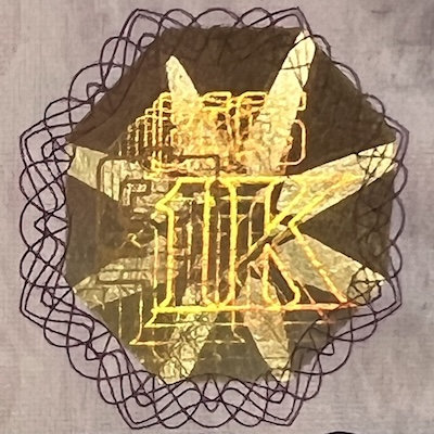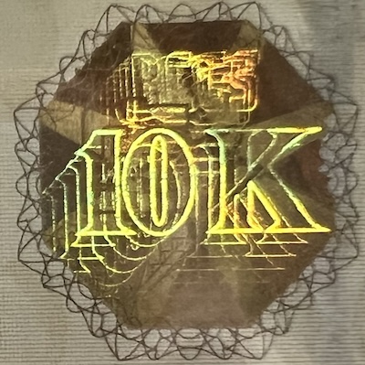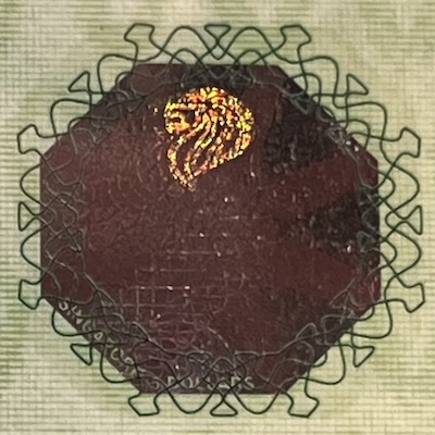 Kinegram is the brand name for a type of metallic security patch that shows different images when the note is tilted. It is made using a specialised micro-engraving process that creates motion or switching effects depending on the viewing angle. The name comes from “kine-” (movement) and “-gram” (image). It is a registered trademark of the Swiss company OVD Kinegram AG. The images are built into the foil using microscopic engraving, making the Kinegram difficult to reproduce with regular printing methods. The technical details of the process are not publicly disclosed.