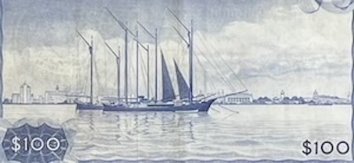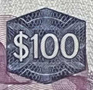 Denomination print: ‘$100’ & ‘ONE HUNDRED DOLLARS’