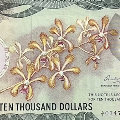 In 1973, Singapore became the first country in Asia to issue a $10000 banknote. This high-value note was mainly used by businesses and wealthy individuals. At that time, just one $10000 note was enough to buy a two-room HDB flat—with some money left over! Because of its high value, it’s the only note in the Orchid series to have two security threads, for added security. The Orchid $10000 is also the largest banknote, along with the Bird $10000, Singapore has ever issued. It measures 203mm by 133mm, which is almost half the size of an A4 paper. Because it was so big, many people had to fold it several times just to fit it into their wallets—this is why most of the notes that survive today have multiple fold marks.