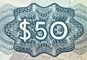 Denomination print: ‘$50’ & ‘FIFTY DOLLARS’