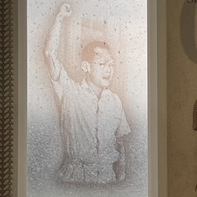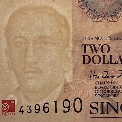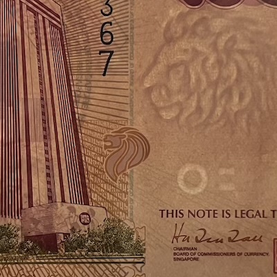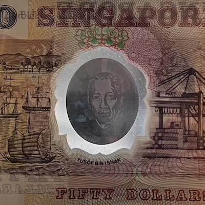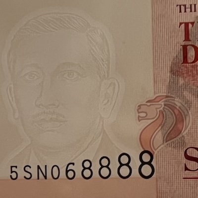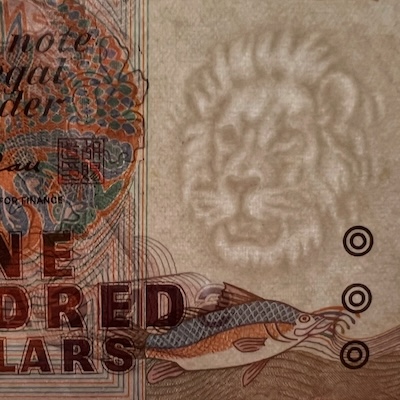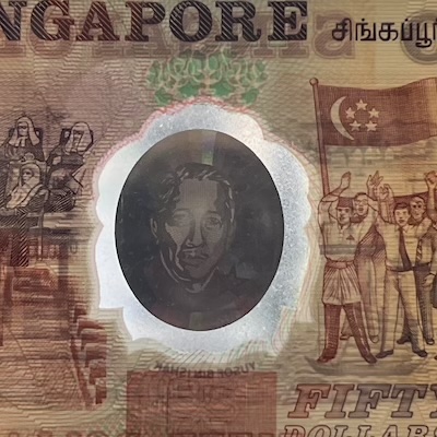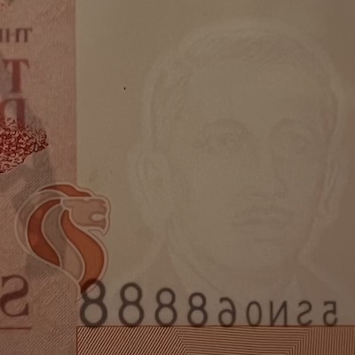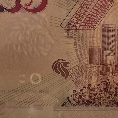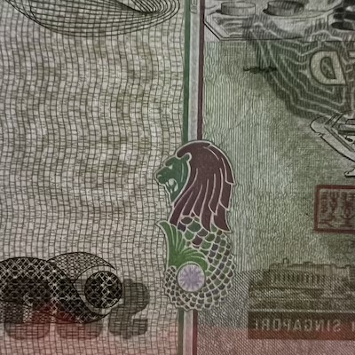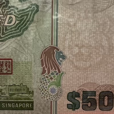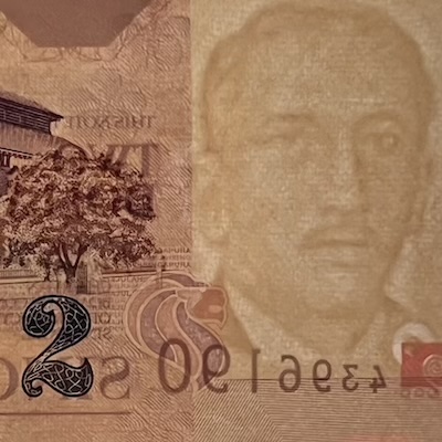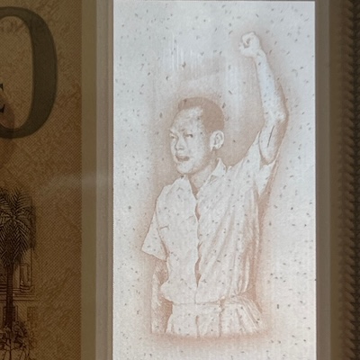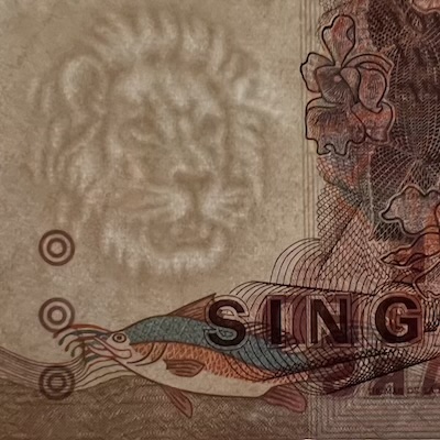 In Singapore’s banknotes, the use of perfect registration began in the Bird series, where the Merlion motif was perfectly aligned front and back—but only on denominations printed by Thomas De La Rue. In the Ship series, perfect registration was used on all denominations $5 and above, and applied to the fish motif printed at the bottom corner of each note. The Portrait series extended this feature to all denominations, with the Lion Head symbol placed beside the watermark, perfectly aligned on both sides of the note. This same Lion Head symbol was used in the 1996 MAS25 $25, 1999 Millennium $2, and 2015 SG50 $10 commemorative notes. Two other commemorative notes used other national icons for perfect registration: the 1990 SG25 $50 note featured Singapore’s national flower Vanda Miss Joaquim, while the 2015 SG50 $50 note used an image of our founding prime minister Lee Kuan Yew.