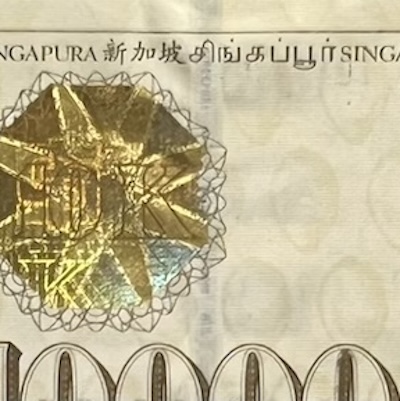The Portrait $10000 is the only banknote in Singapore’s history to be printed with a golden hue, chosen to reflect its status as the highest denomination. It is also one of only two notes in the Portrait series—the other being the $1000 note—to feature a gold Kinegram; all other denominations used silver ones. Like the $10000 notes from the earlier Orchid, Bird, and Ship series, this note had only one signatory, making it the only note in the Portrait series with this feature. It was also the last $10000 note ever issued in Singapore: in 2014, the government stopped printing it in order to reduce the risk of money laundering, as such high-value notes made it easy to move large sums of money quietly and quickly.