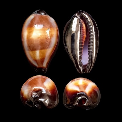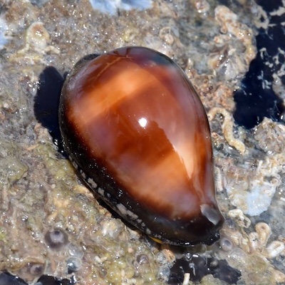 The Onyx Cowrie is a small sea snail with a smooth, shiny shell that looks like a polished gemstone. Its shell is usually dark brown or black with lighter lines or streaks, just like the layers of the onyx stone, which is how it got its name. It lives in warm tropical waters across the Indo-Pacific region. A long time ago, people loved this cowrie for its beauty. Some made it into necklaces, decorations, or lucky charms, because they believed it could bring good fortune and protection. Today, shell collectors still admire the Onyx Cowrie for its glossy surface and attractive colours.