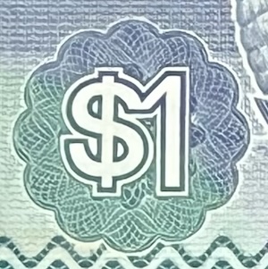Denomination print: ‘$1’ & ‘ONE DOLLAR’