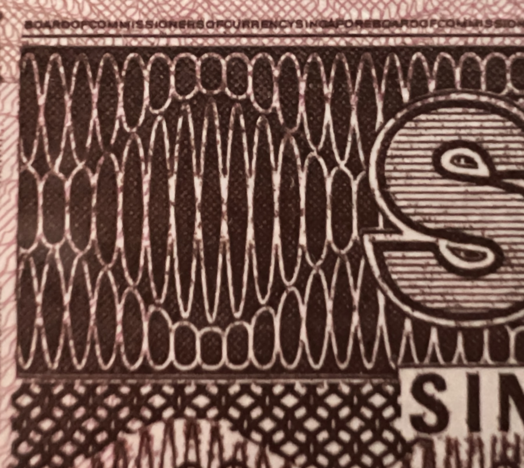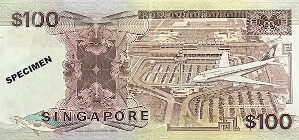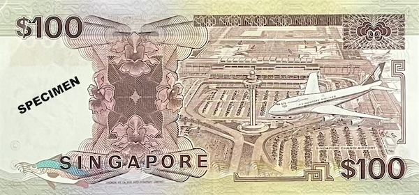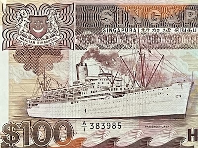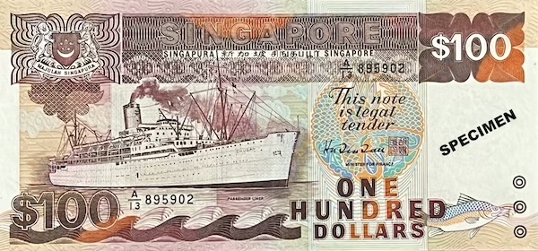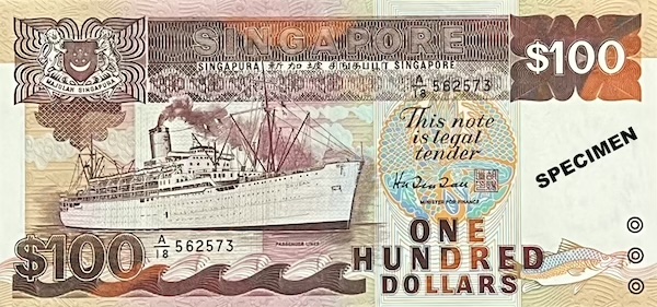 The Ship $100 note marked two significant firsts. It was the first $100 note to be printed in brown colour—unlike the earlier Orchid and Bird Series $100 notes, which were blue like the $50 notes, making it harder to tell the two apart. Singapore uses colour to help users easily identify different denominations, but brown couldn’t be used for the $100 note in the past because the $20 and $25 notes were already brown. With the discontinuation of those denominations in the Ship Series, brown was finally available, giving the $100 note a clearer identity. The Ship $100 was also the first—along with the $50 note in the same series—to feature micro-lettering, a new security feature where tiny words were printed on the note (above the word ‘SINGAPORE’). These words could only be seen under 10 to 20 times magnification, making the note harder to counterfeit.