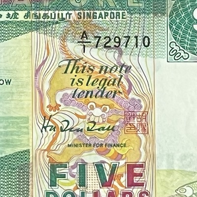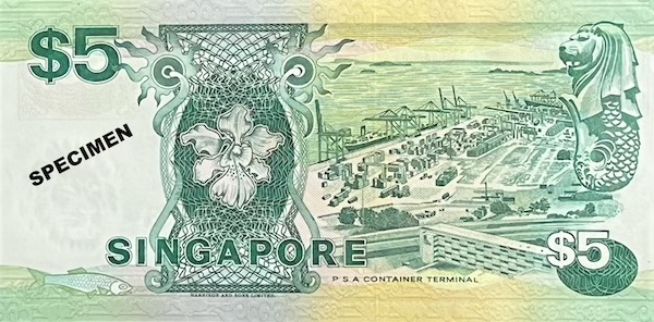 Apart from the Ship $2 and Portrait $10, the Ship $5 is the only note in Singapore’s history to use two printers. It was first printed by Thomas De La Rue, then Harrison and Sons. In addition, other than the Orchid $1000, the Ship $5 is the only one with a physical size that is not larger than its lower denomination: at 133mm X 63mm, it is of the same size as the Ship $2.