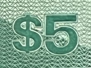 Denomination print: ‘$5’ & ‘FIVE DOLLARS’