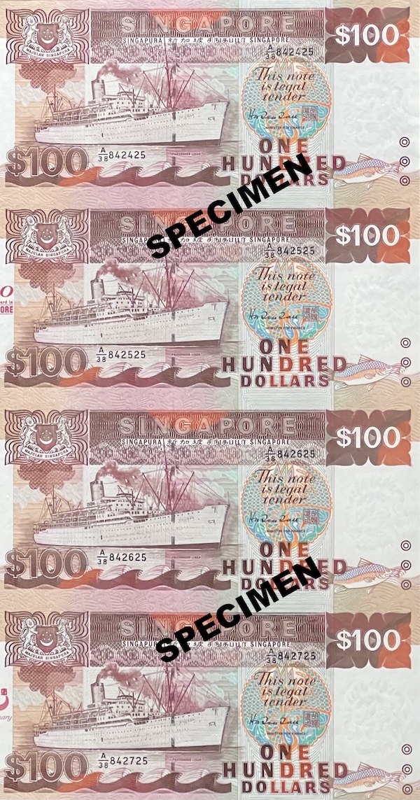 This note uses the design of the SG25 $50 commemorative note, but includes an overprint “9 August 1990”, marking the exact date of Singapore’s 25th anniversary. The note also comes with the prefix A reserved for these special editions. 300,000 pieces were issued.